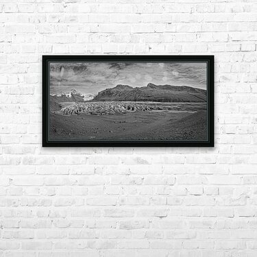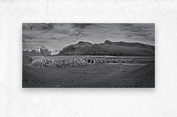 This artwork captures the powerful stillness of a wide, open landscape. The glacier stretches across the scene like a frozen river of texture, set against rugged mountains and a dramatic sky. Even in black and white, the details feel bold and full of depth. It’s the kind of piece that adds strength, calm, and a touch of wild adventure to any room.