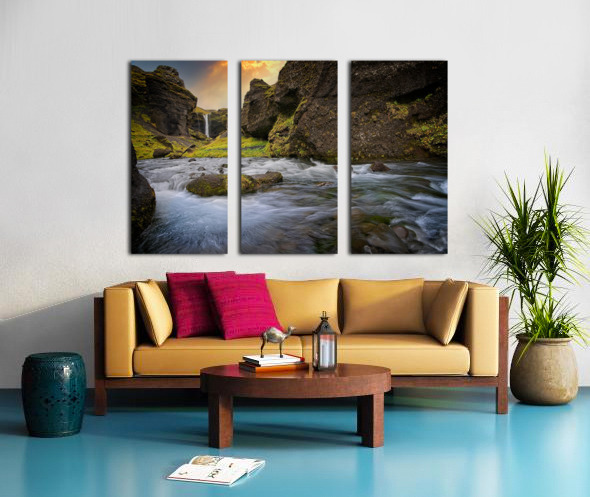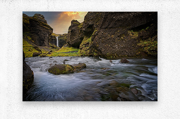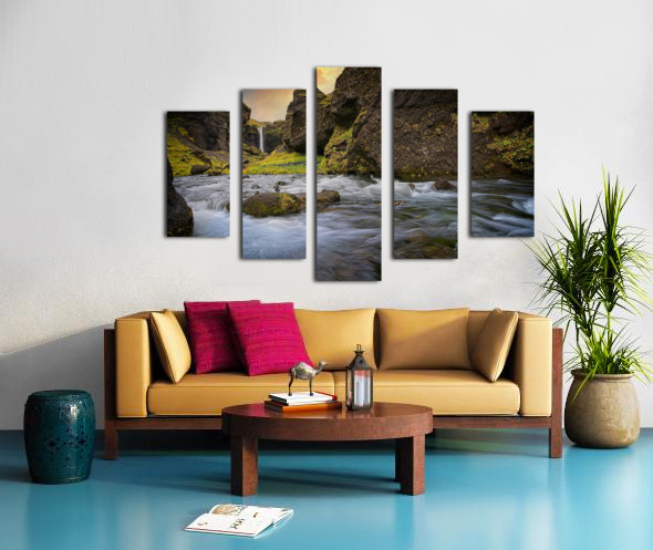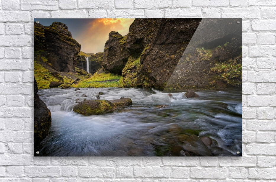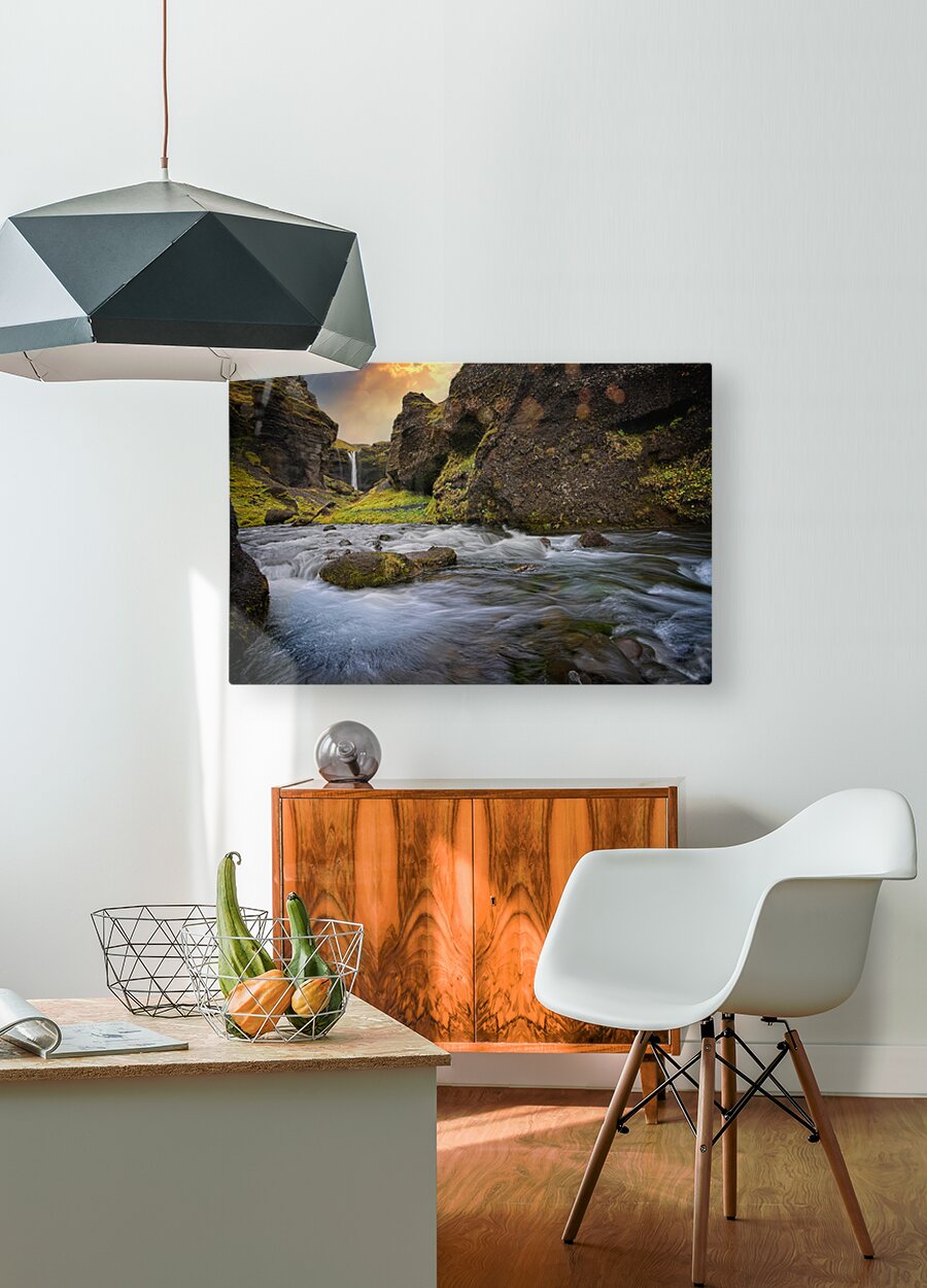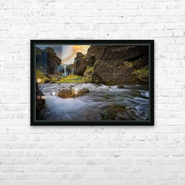 This scene feels like stepping into a hidden paradise. The rushing water swirls with energy in the foreground while a gentle waterfall glows in the distance, framed by steep moss-covered cliffs. The warm light in the sky adds a magical touch, making the whole place feel alive and welcoming. It’s the kind of artwork that instantly refreshes a room and brings a sense of adventure and calm all at once.