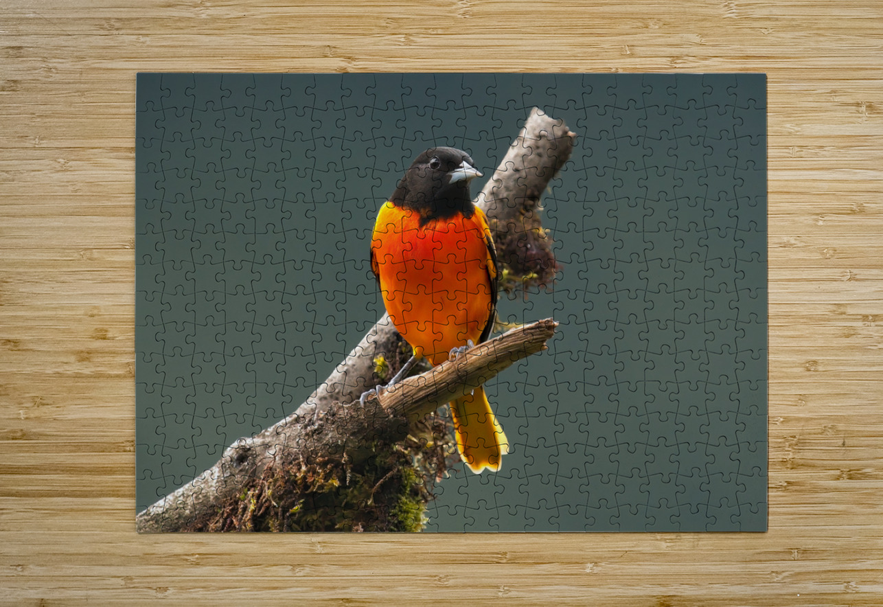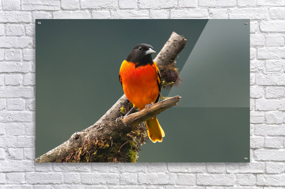 Perched with quiet confidence, the vibrant songbird radiates brilliant warmth. The contrast between its fiery feathers and the serene green backdrop c...[+]