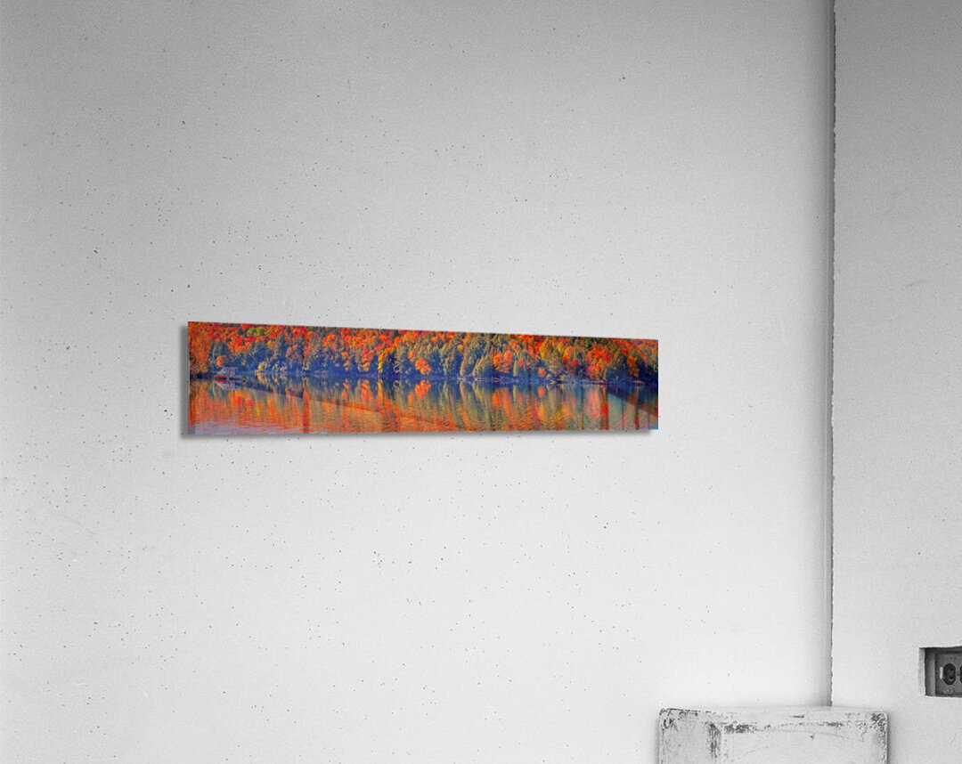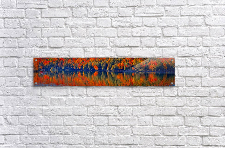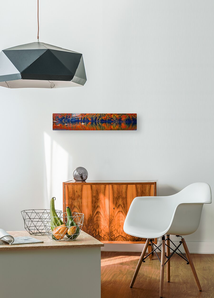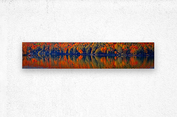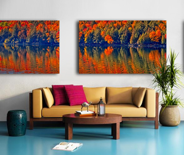A breathtaking panorama of fiery autumn trees mirrored perfectly on still water. This artwork fills your space with warmth, texture, and the unmistakable glow of fall—ideal for creating an inviting, upscale atmosphere.