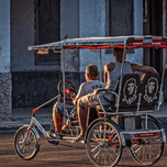 Warm evening light highlights a bicycle taxi carrying two passengers, detailed with iconic Cuban imagery. This artwork blends everyday life with cinem...[+]