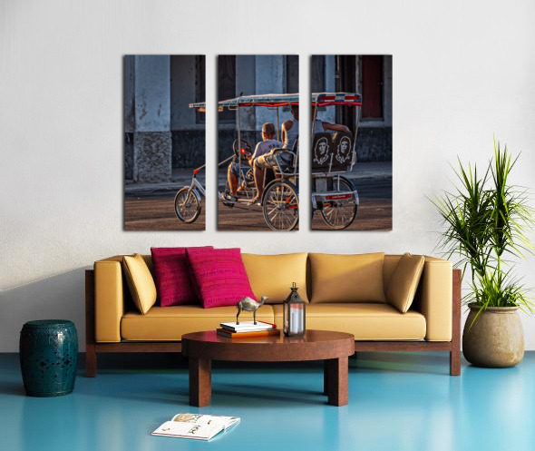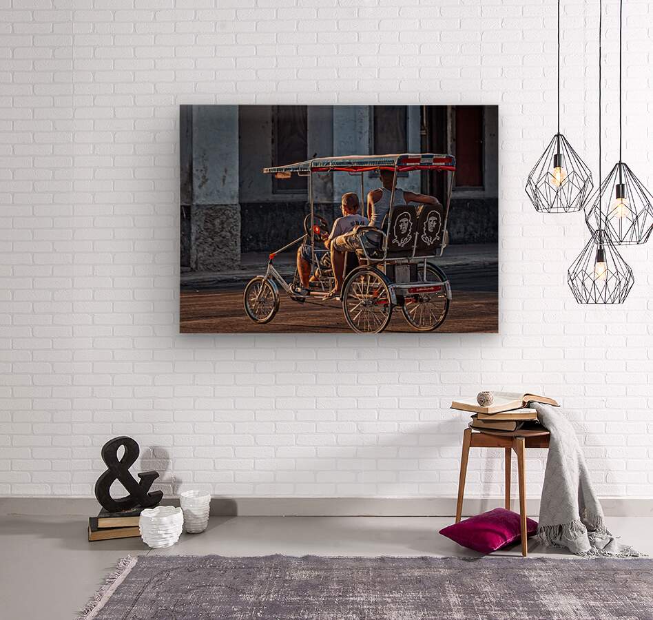 Warm evening light highlights a bicycle taxi carrying two passengers, detailed with iconic Cuban imagery. This artwork blends everyday life with cinematic lighting for a warm, storytelling centerpiece.