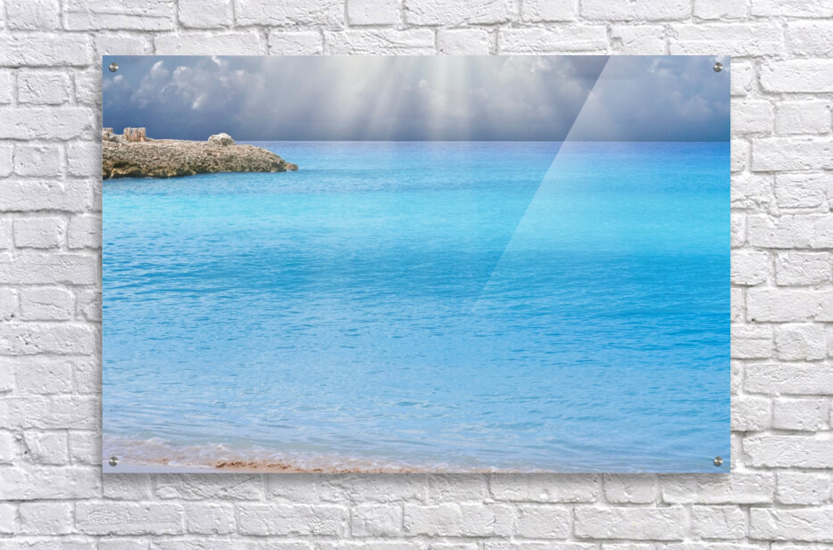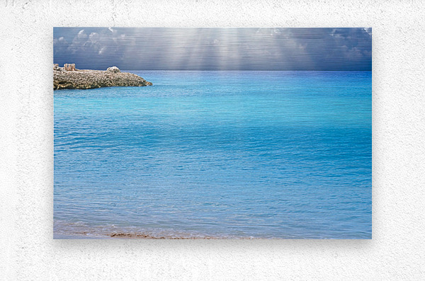 Immerse yourself in the serenity of crystal-blue waters illuminated by dramatic rays of sunlight breaking through the clouds. This radiant seascape ca...[+]