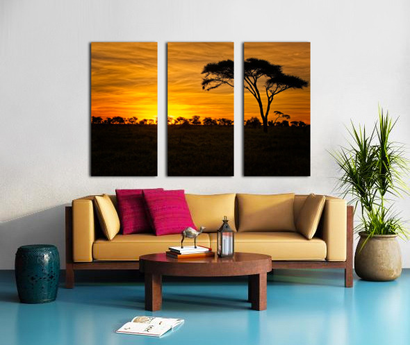 Bathe your space in the warm glow of an African sunrise with this striking silhouette of an acacia tree against a sky painted in deep golds and fiery ...[+]