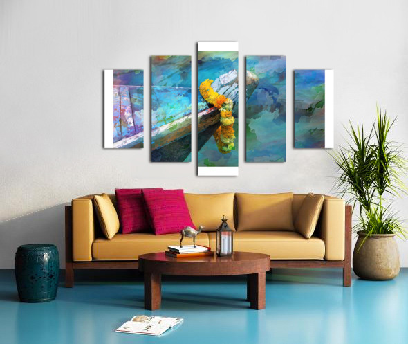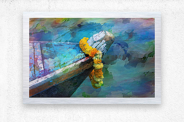 This colorful artwork blends soft watercolor textures with the worn wood of a boat’s bow. The bright flower garland adds a joyful touch, making the whole scene feel peaceful and full of life. It’s a calming, uplifting piece that brings color and serenity into any space.