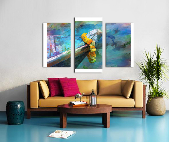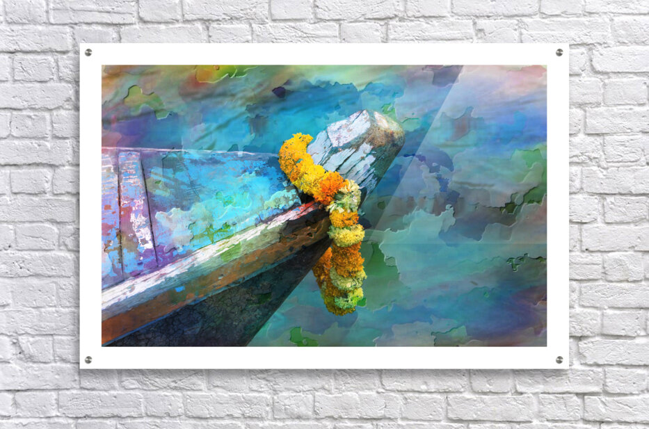 This colorful artwork blends soft watercolor textures with the worn wood of a boat’s bow. The bright flower garland adds a joyful touch, making the whole scene feel peaceful and full of life. It’s a calming, uplifting piece that brings color and serenity into any space.
