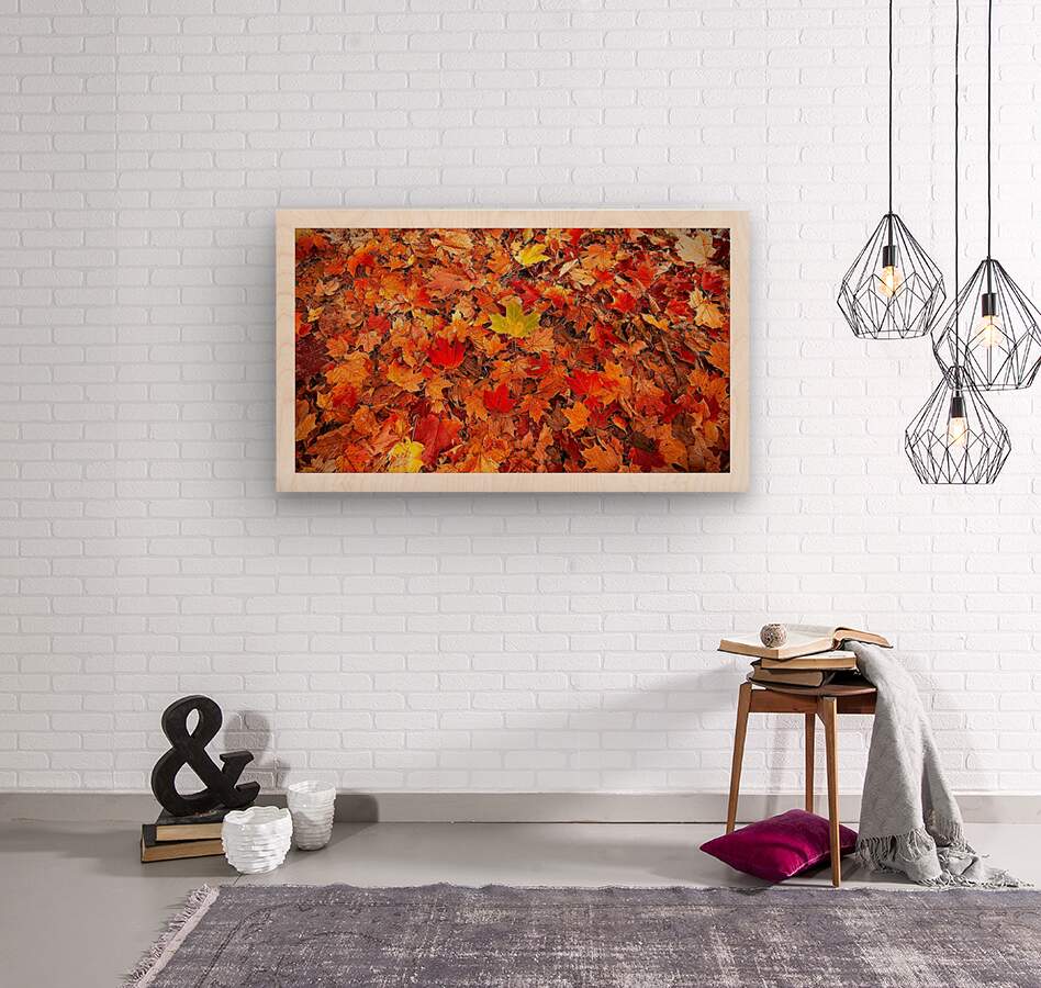 This photo celebrates fall in all its colorful glory. A blanket of vibrant leaves creates a rich tapestry of reds, oranges, and yellows with one bright leaf standing out. It’s warm, cozy, and perfect for adding seasonal charm and natural beauty to your home.