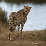 Turning back toward the viewer, a cheetah stands at the water’s edge. Her posture mixes elegance with alert readiness — a predator aware of every ...[+]