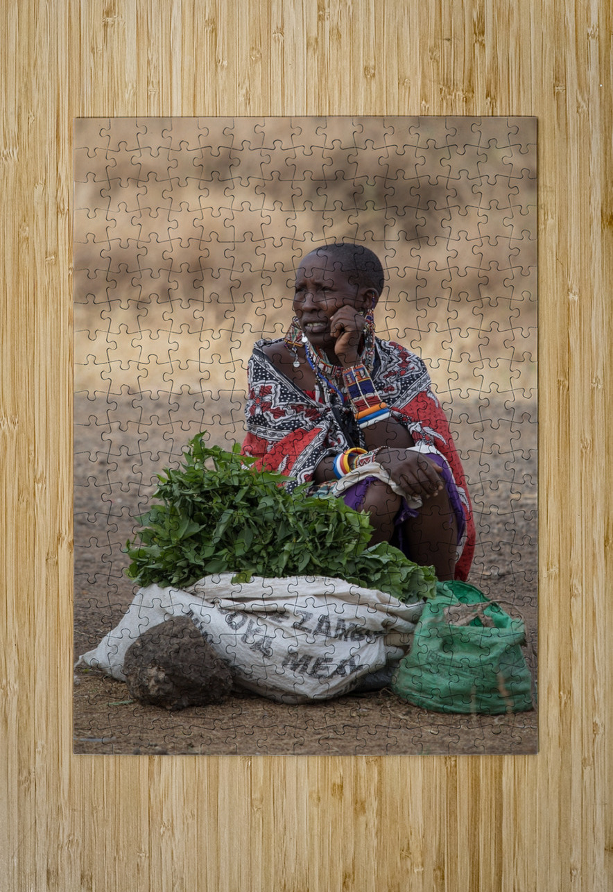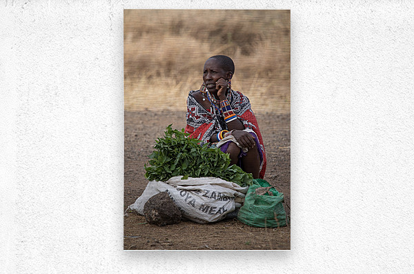A Masai woman sits beside bundles of fresh greens, adorned with colorful beadwork and traditional fabrics. Her thoughtful expression adds a narrative ...[+]