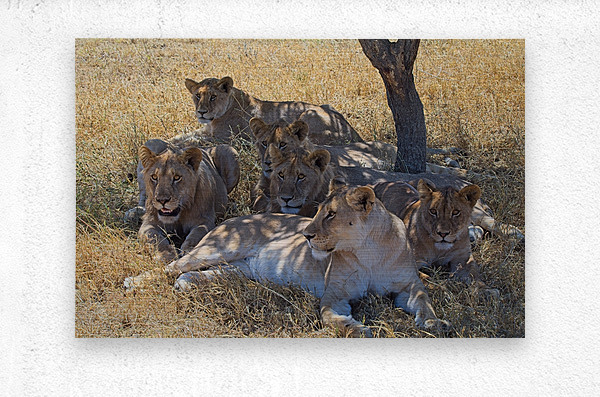 A group of young lions lounges beneath the shade of a tree, their tawny coats blending with the dry grass. Their relaxed posture contrasts with their ...[+]