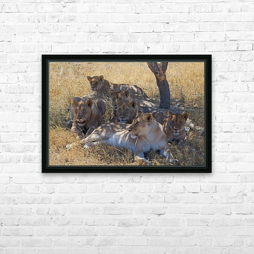 A group of young lions lounges beneath the shade of a tree, their tawny coats blending with the dry grass. Their relaxed posture contrasts with their attentive eyes.