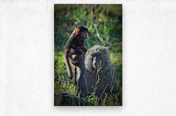 A baby baboon perched proudly while its watchful guardian stands close behind.