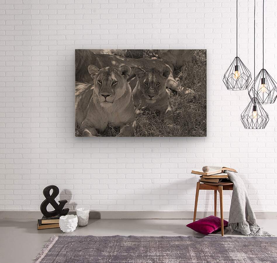 Two lionesses bask in the shade, their calm gaze revealing the quiet strength of Africa’s apex predators. This intimate portrait highlights raw majesty and feminine power—ideal for statement walls and wildlife-themed decor.