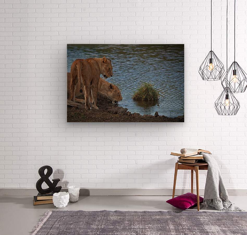 Lionesses lean forward with graceful intensity, drawn to the calm shimmer of the water.
