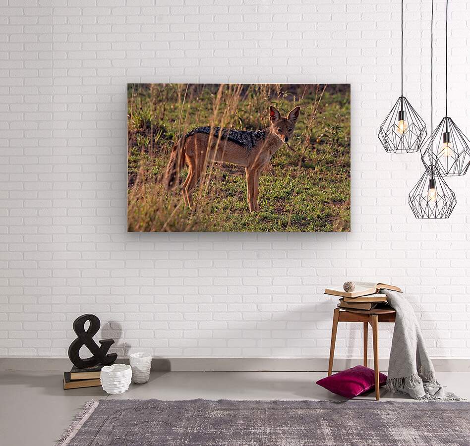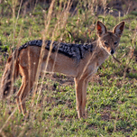 A jackal pauses mid-step, alert and elegantly poised in the tall grasses.