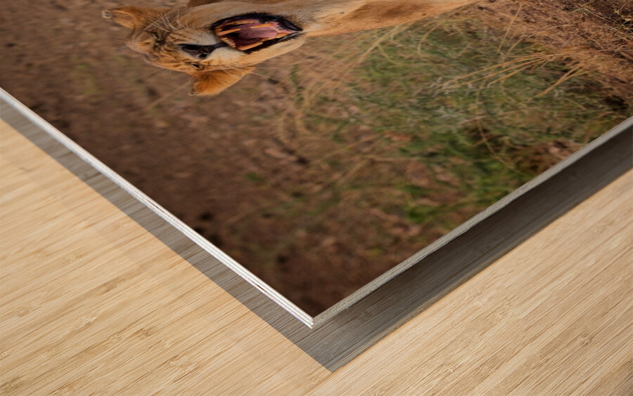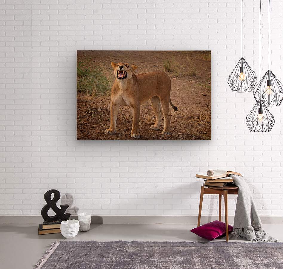 A lioness stands mid-yawn—or mid-roar—her fierce expression showcasing wild power and personality.