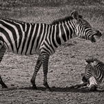 A tender monochrome moment between a mother zebra and her resting foal. The interplay of bold stripes and soft shadowing creates a striking contrast t...[+]