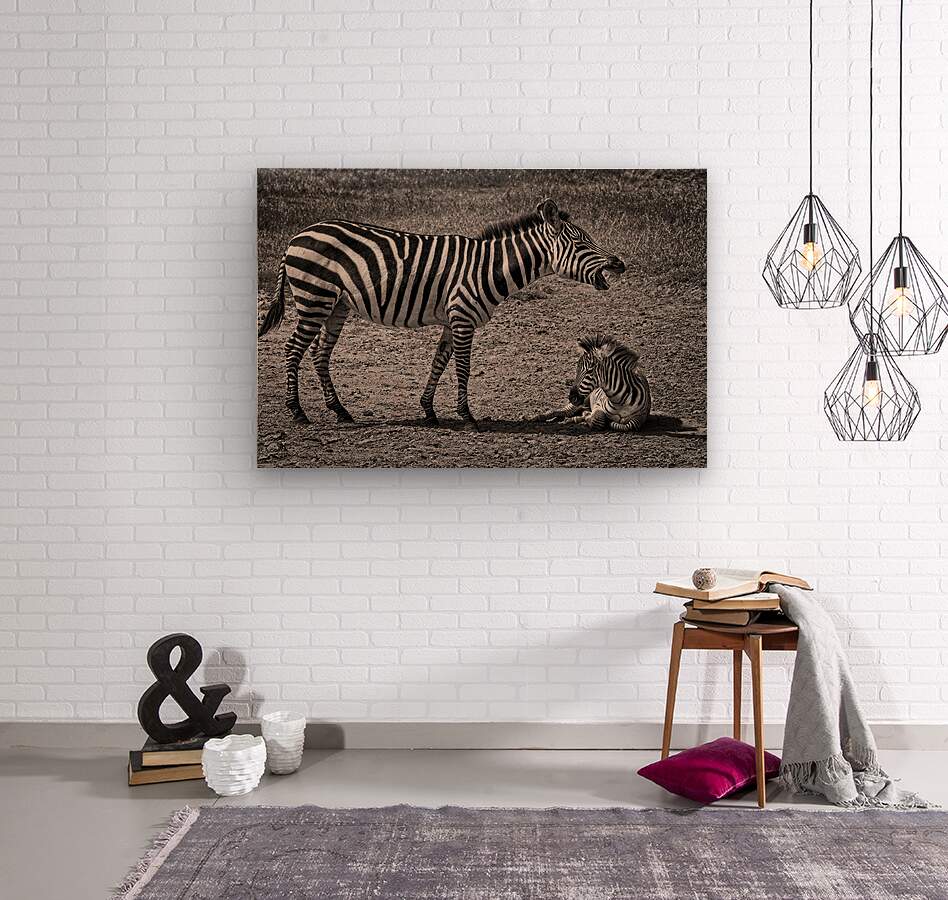 A tender monochrome moment between a mother zebra and her resting foal. The interplay of bold stripes and soft shadowing creates a striking contrast that brings refined elegance to any art-focused interior. Perfect for collectors seeking both emotion and visual rhythm.