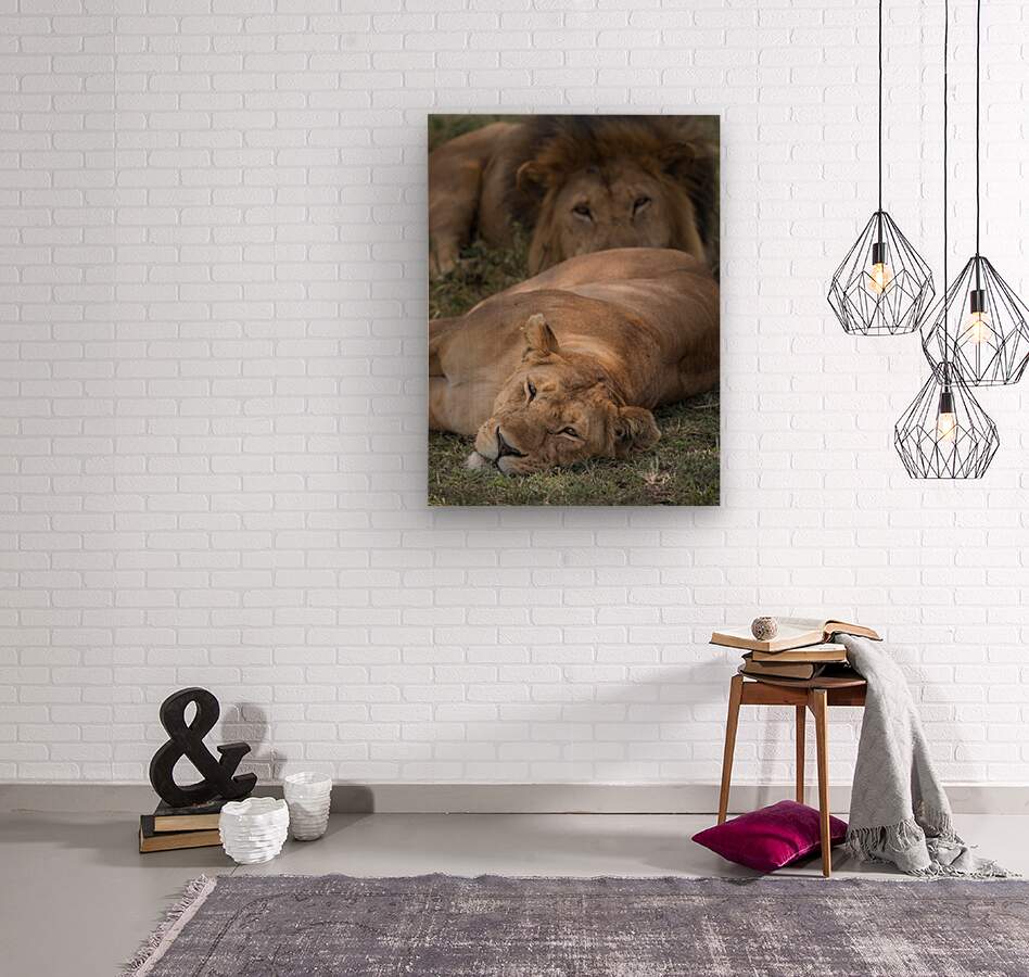 A lioness lounges peacefully in the grass while the watchful eyes of a male lion linger protectively behind her.