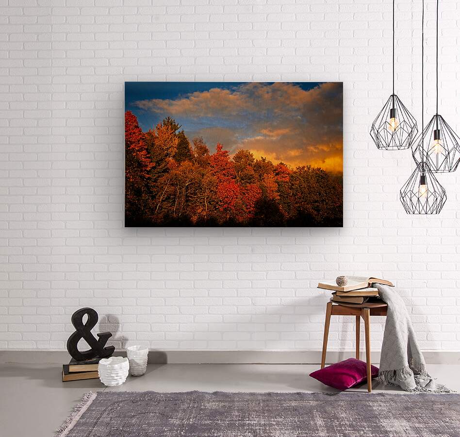 A burst of glowing autumn reds, oranges, and golds lights up the treetops under a dramatic evening sky. This print adds instant warmth and seasonal richness to your home. Perfect for living rooms, hallways, dining areas, or cozy cabins—anywhere you want to spark a welcoming, vivid atmosphere.