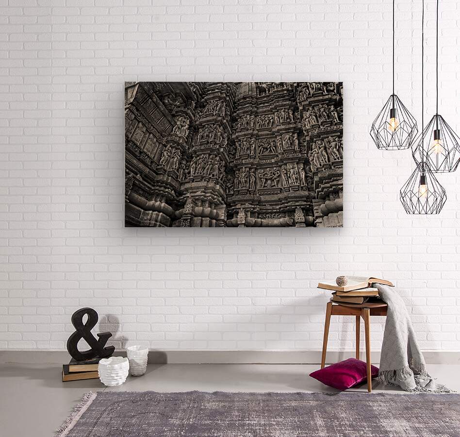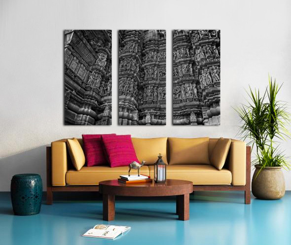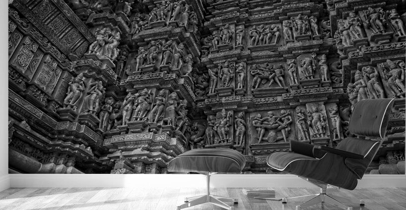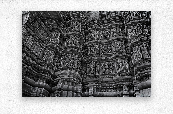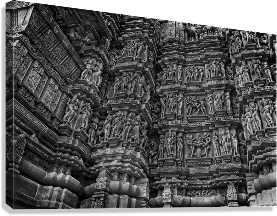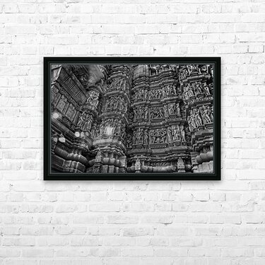 Intricate carvings from ancient temple walls fill this powerful architectural study. The black-and-white palette highlights texture, craftsmanship, and historical mystery — an exceptional statement piece for art lovers and cultural enthusiasts.