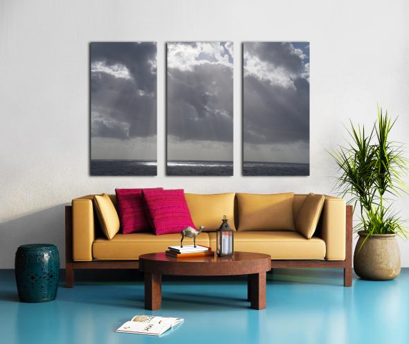 Sunbeams pierce heavy ocean clouds in this powerful seascape, capturing nature’s quiet resilience and divine light. Ideal for meditation rooms, serene interiors, or anyone drawn to atmospheric, minimalist photography.