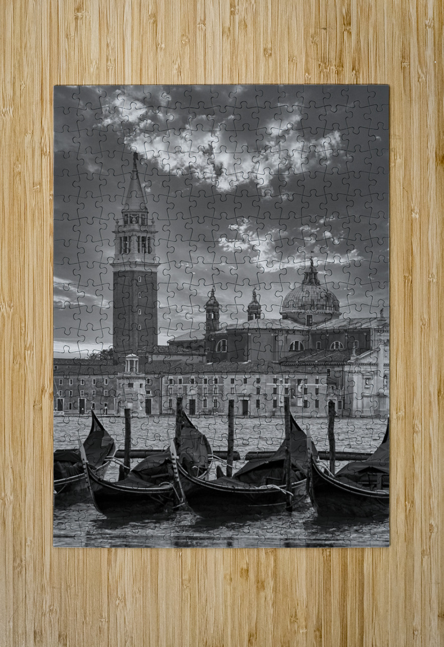 A timeless black-and-white portrait of Venice, where gondolas rest beneath dramatic skies and historic architecture rises with quiet grandeur. This piece brings European romance and Old-World elegance to any space — perfect for collectors of travel and architectural art.