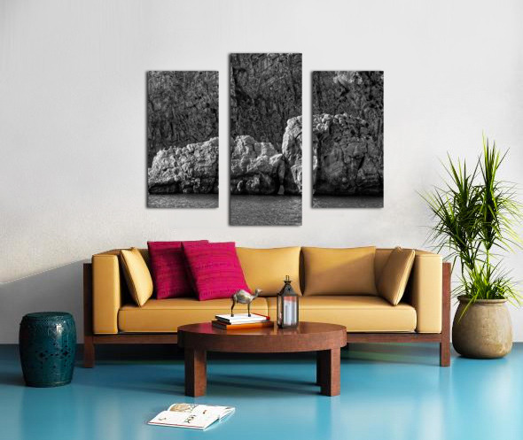 Massive cliffs and rugged rock formations stand guard over calm water. This monochrome image adds strength and character to any space—quietly powerful and endlessly fascinating.