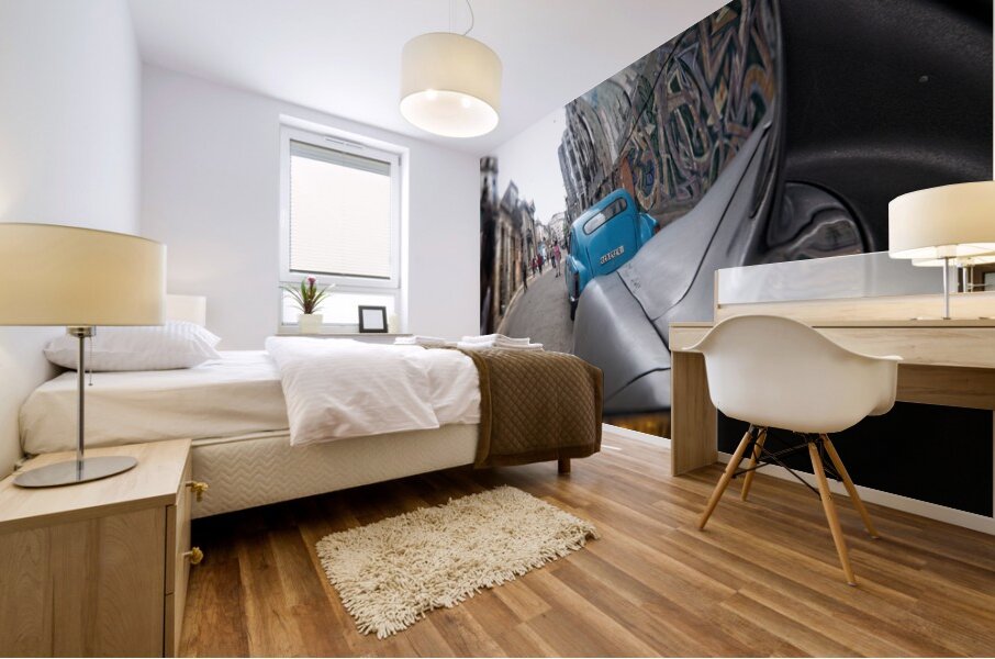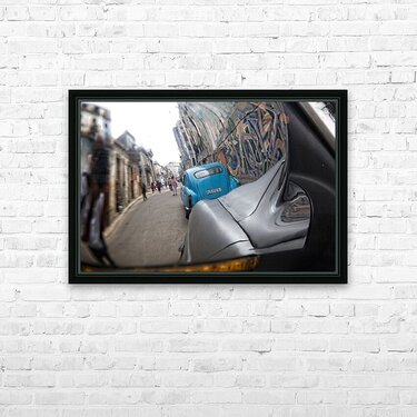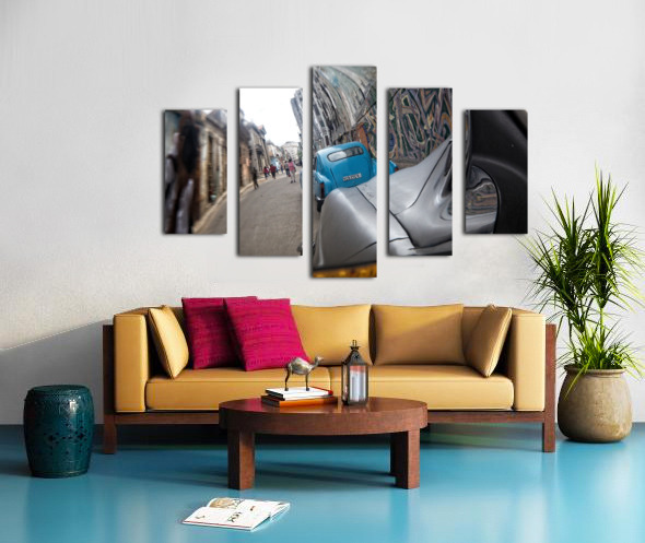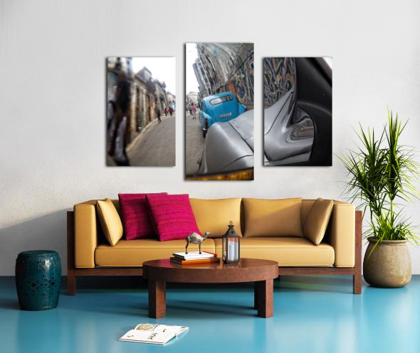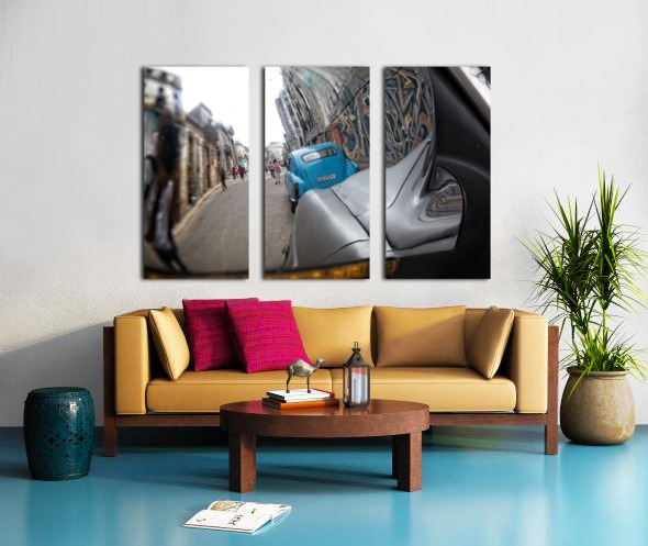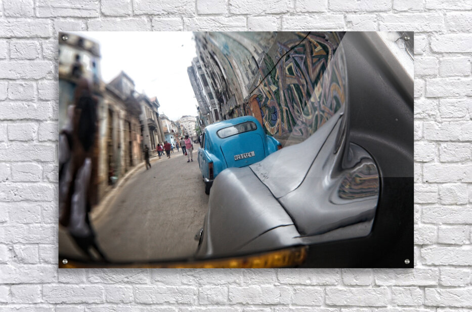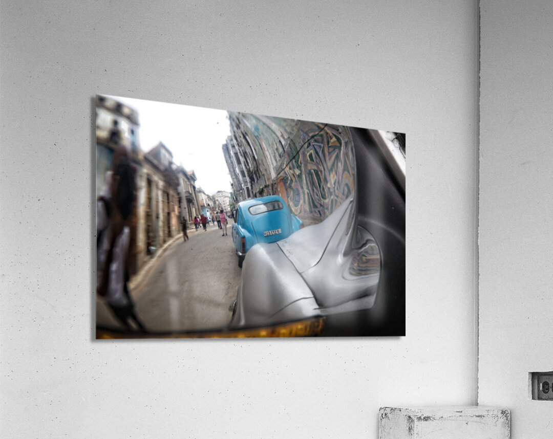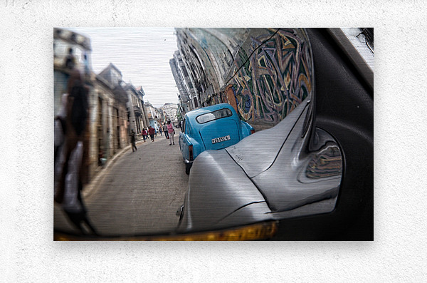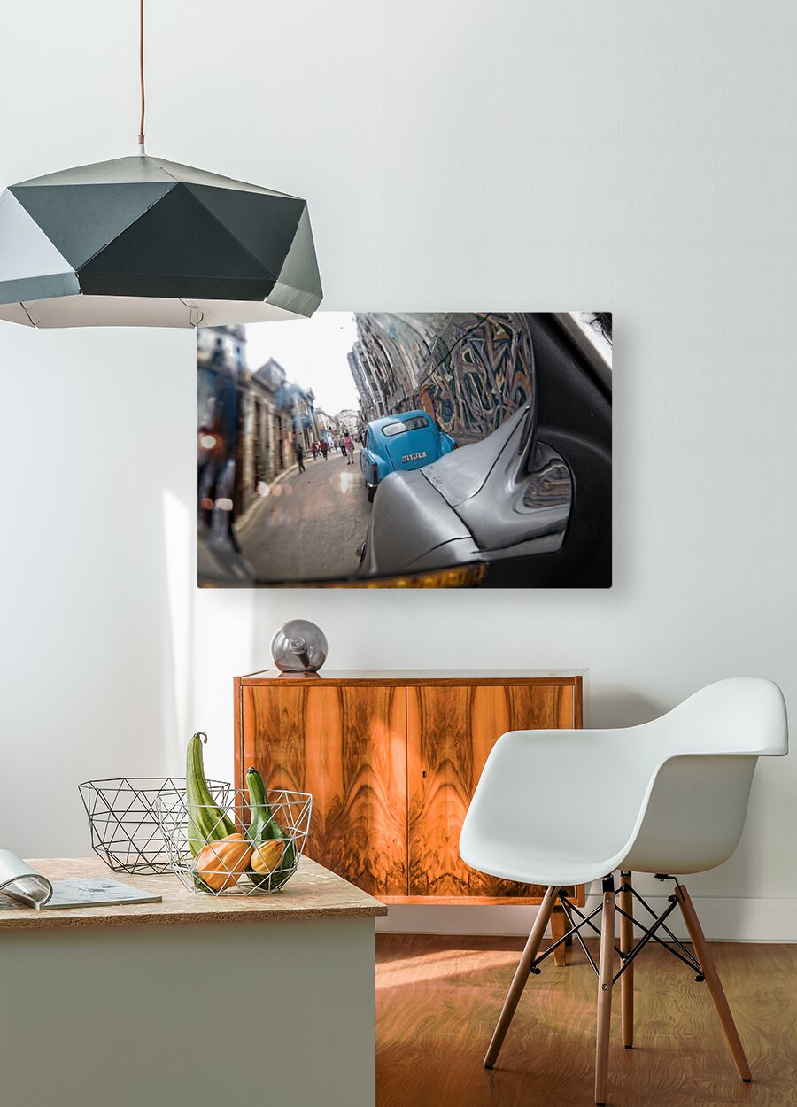 This creative street perspective turns a simple car mirror into a window into Havana’s lively streets. Rich textures, motion, and urban character make this a compelling contemporary piece for modern interiors.