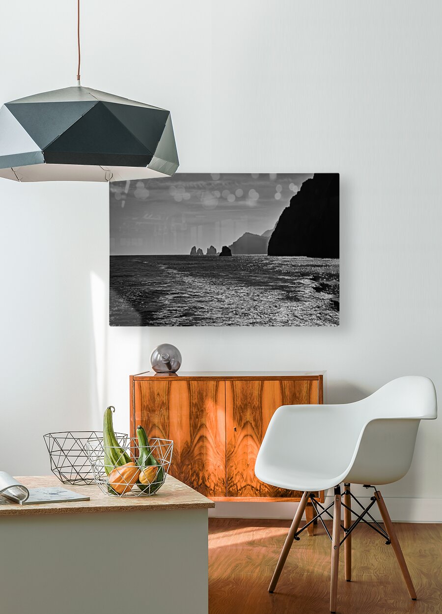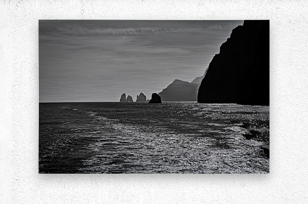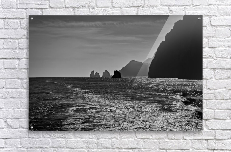 This scene feels calm and mysterious in the best way. The sunlight dances across the water, creating a bright, shimmering path that leads your eye toward the distant sea stacks. The dark cliffs on the right add a strong, dramatic contrast that makes the whole image feel powerful and peaceful at the same time. It’s a striking piece that brings a sense of depth, quiet, and coastal beauty to any space.