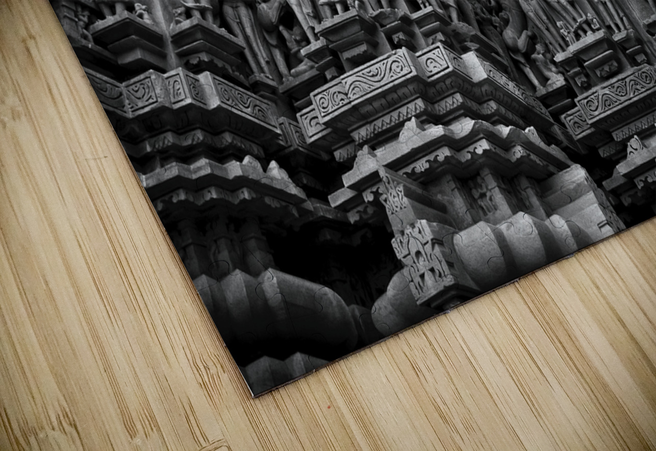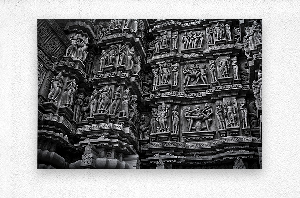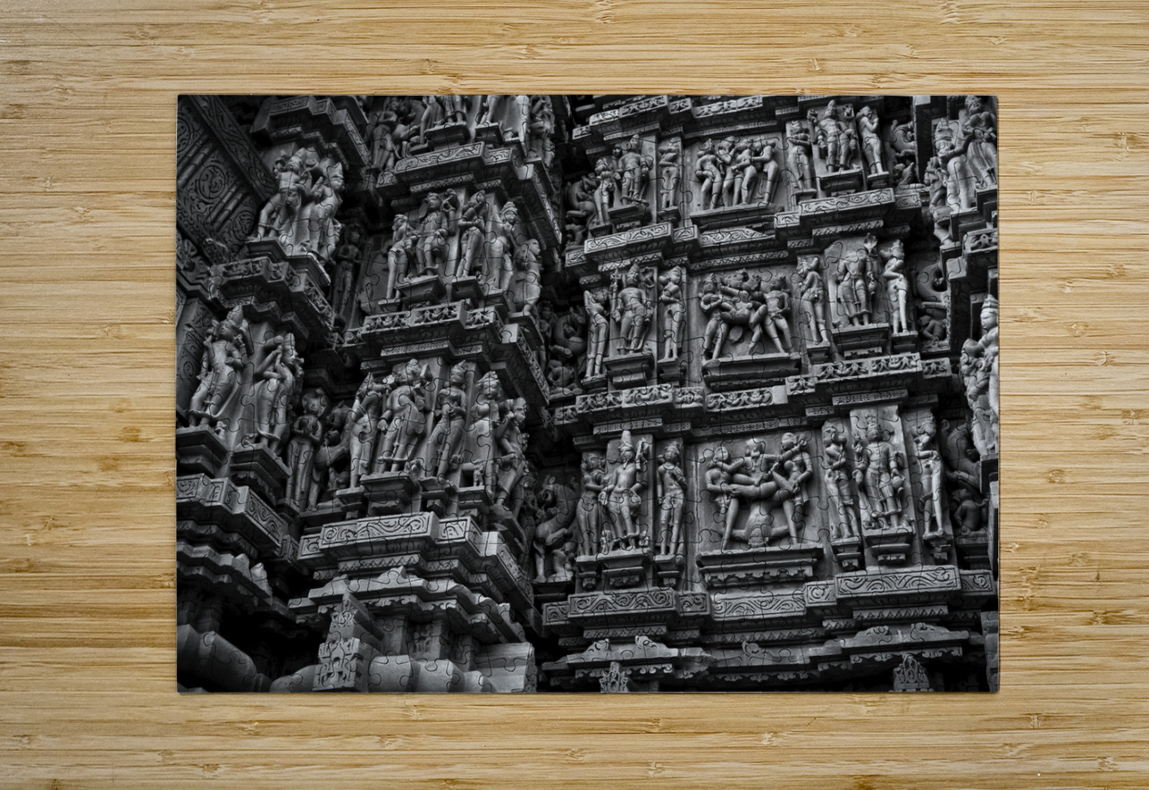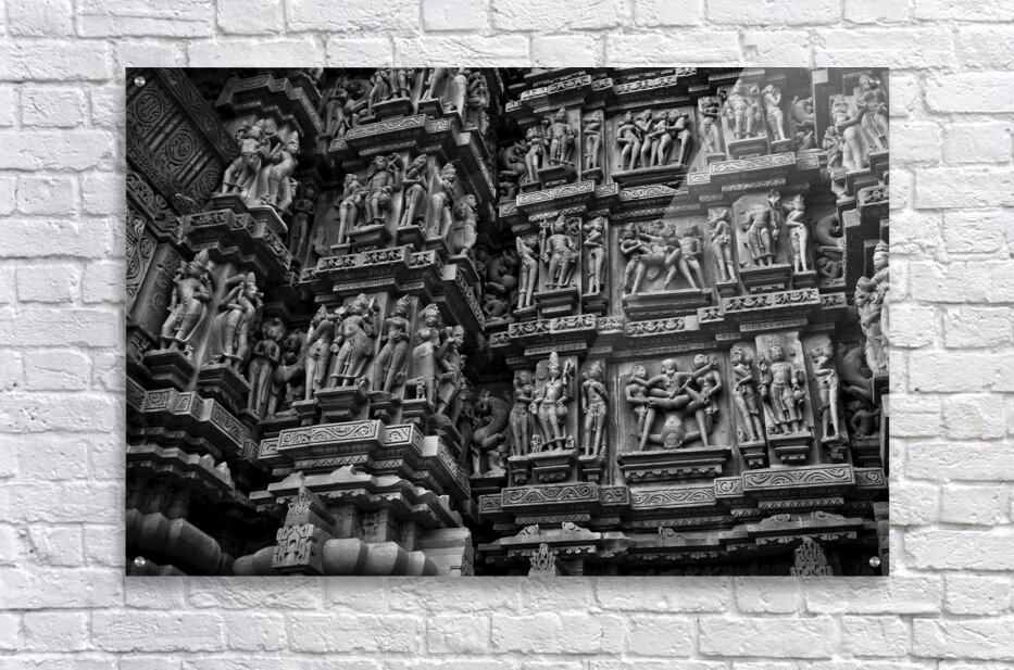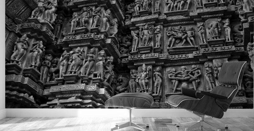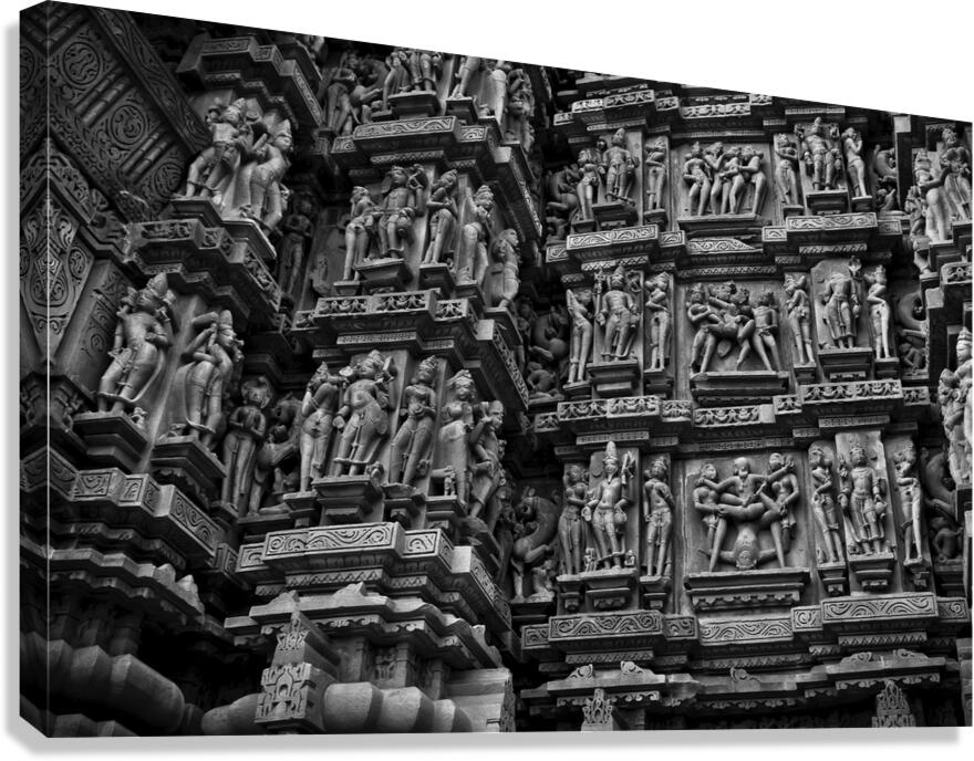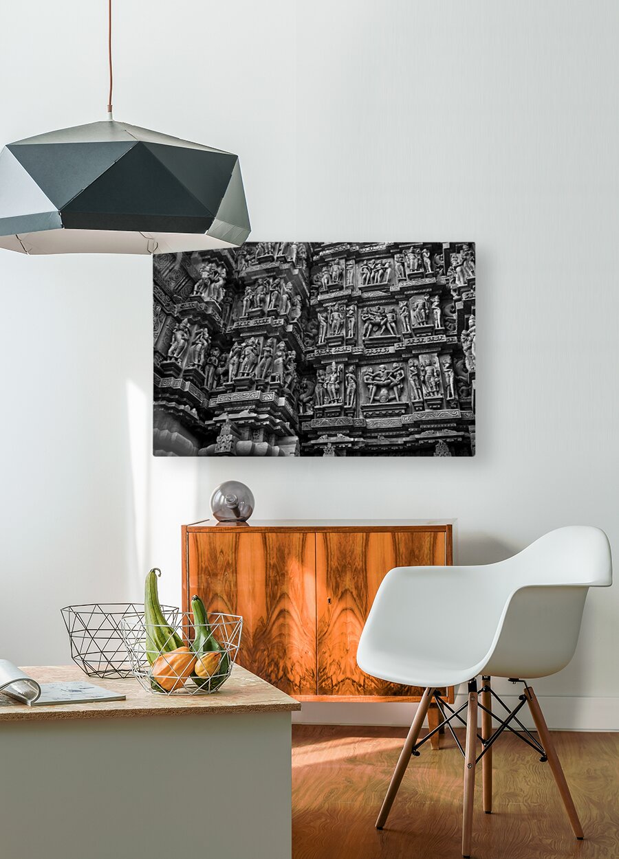 This dramatic black-and-white image highlights the incredible detail of ancient stone carvings. The repeating figures and deep textures make the wall feel alive with history. It’s a bold, elegant piece that adds depth and cultural beauty to your space.