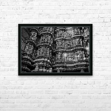 This dramatic black-and-white image highlights the incredible detail of ancient stone carvings. The repeating figures and deep textures make the wall ...[+]
