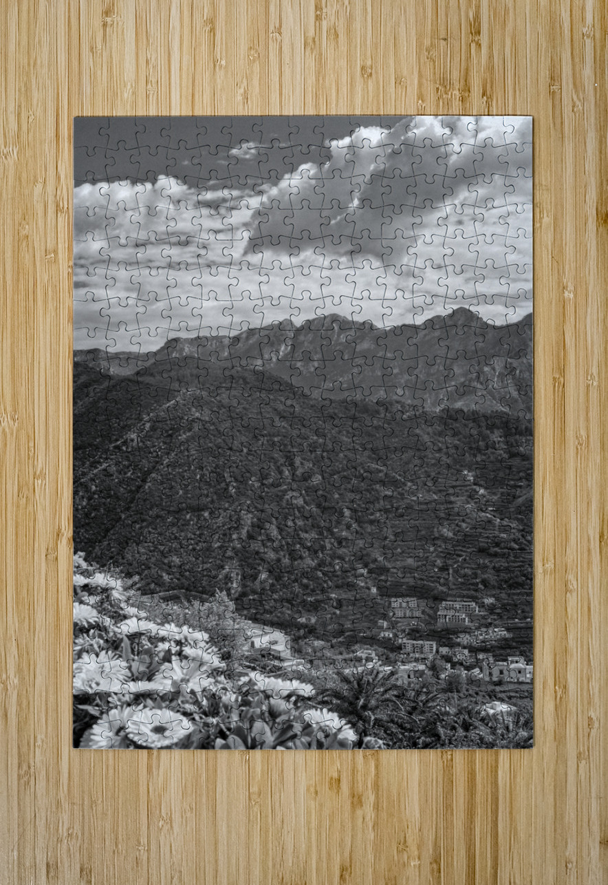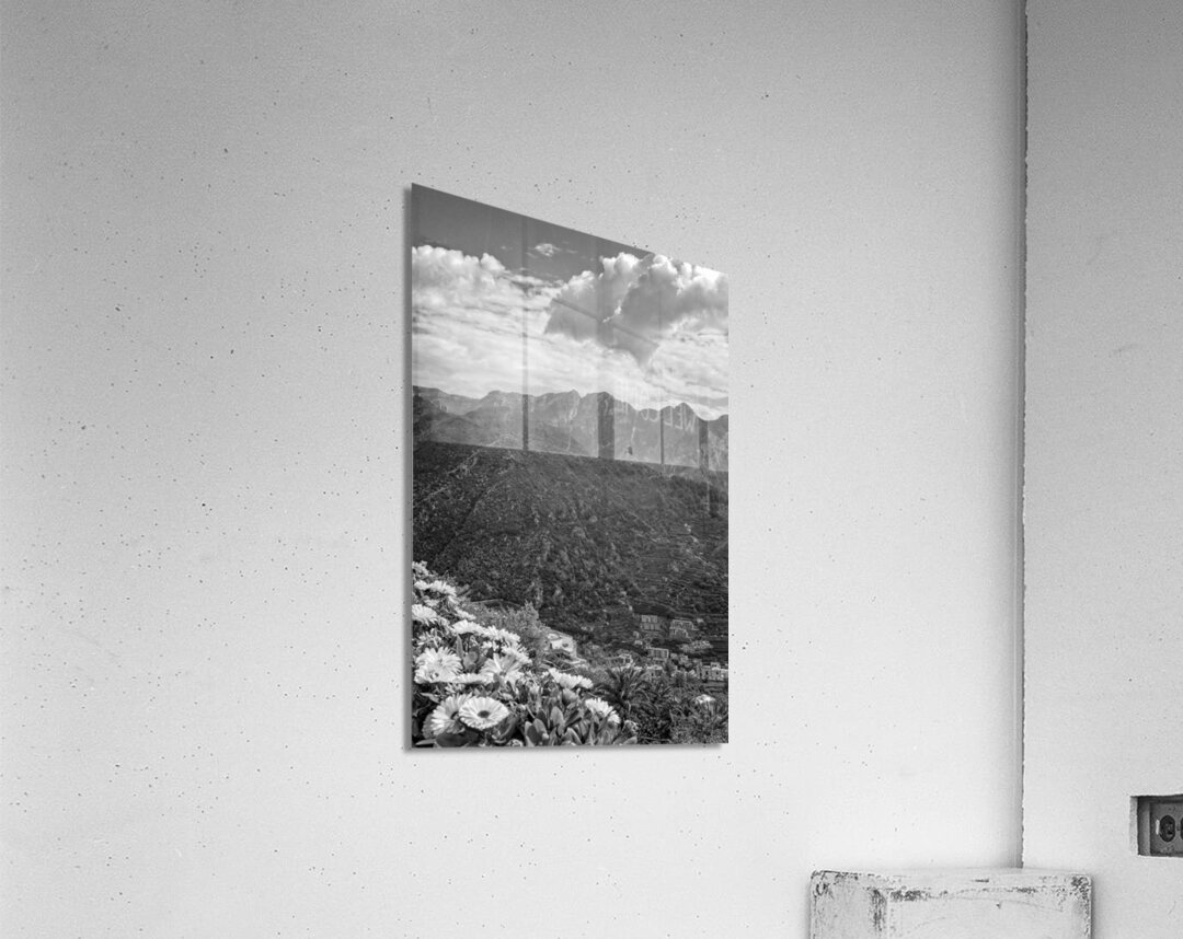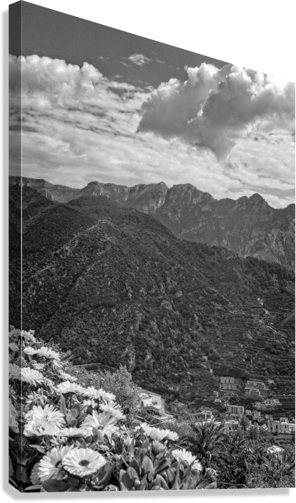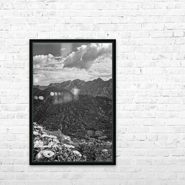 This elevated Italian landscape blends dramatic mountain views with delicate foreground flowers. The monochrome finish creates a timeless, classic ele...[+]