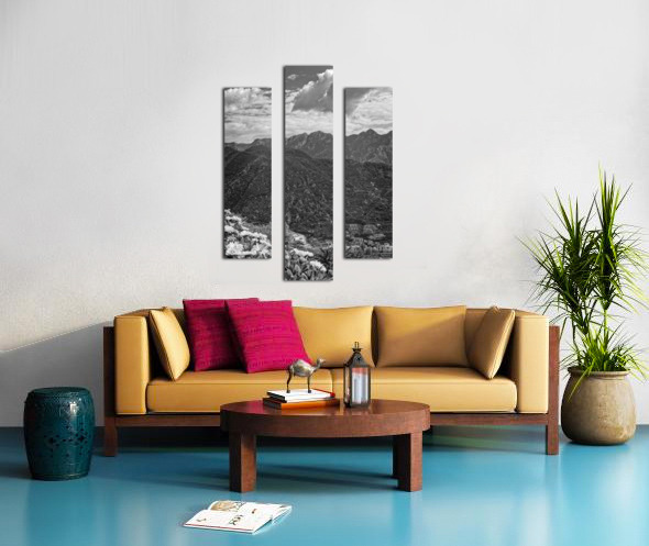 This elevated Italian landscape blends dramatic mountain views with delicate foreground flowers. The monochrome finish creates a timeless, classic elegance suited for luxury interiors.