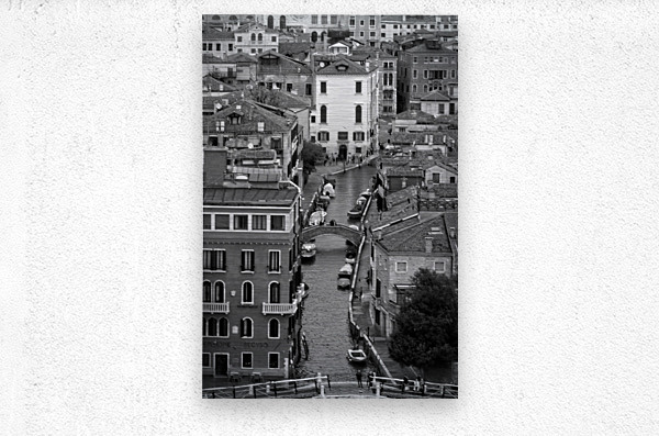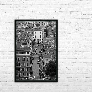 A charming bird’s-eye look at Venice’s narrow waterways. The cobbled rooftops and little bridges create a timeless European vibe that instantly upgrades any wall.