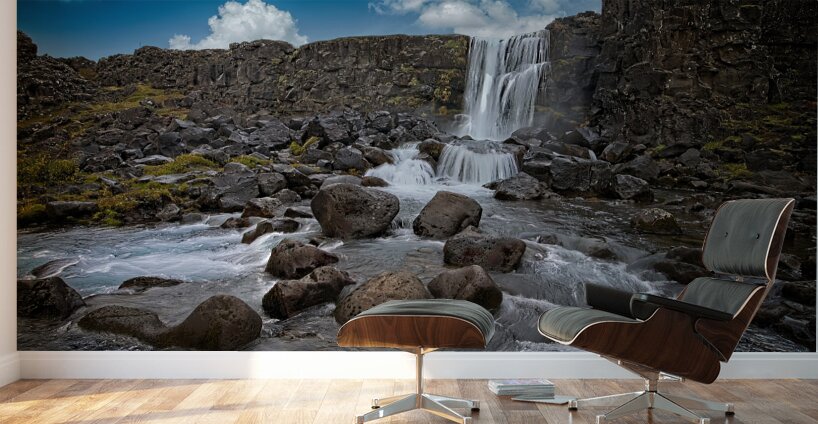 A gentle waterfall cascades over rugged basalt cliffs, its waters weaving through smooth volcanic stones under a bright Icelandic sky. The contrast be...[+]