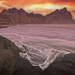 Waves gently sweep across the black sand beach of Stokksnes as the jagged peaks of Vestrahorn rise under a fiery Icelandic sunset. The sky glows with ...[+]