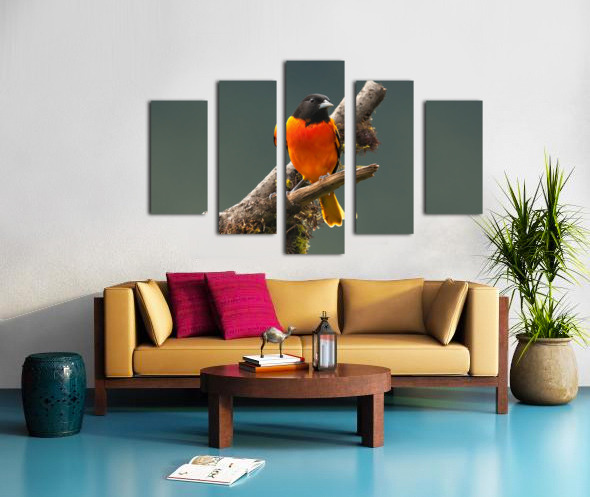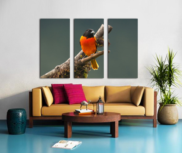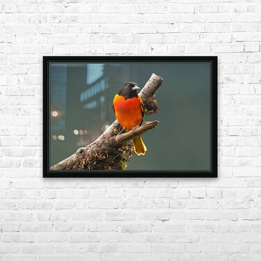 Perched with quiet confidence, the vibrant songbird radiates brilliant warmth. The contrast between its fiery feathers and the serene green backdrop c...[+]