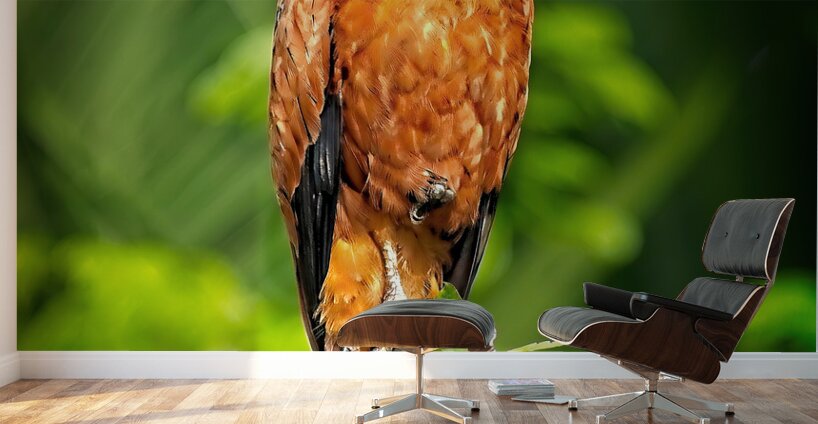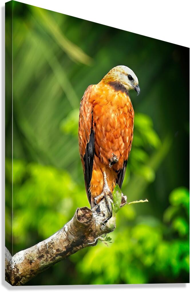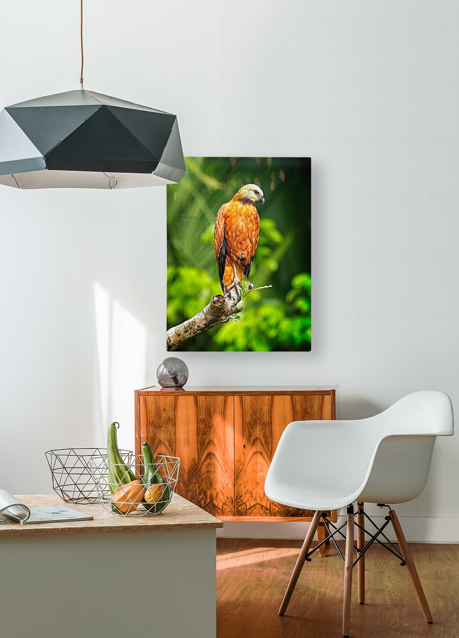 Warm amber feathers and a noble stance make this bird look like it’s guarding the rainforest itself. A dramatic, regal addition to any nature-themed wall.