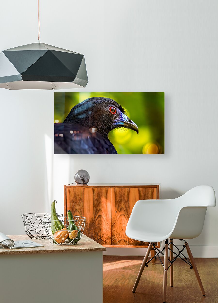 Deep black feathers, vivid red eyes—this close-up portrait is dramatic and full of intensity. A bold, modern piece for collectors who like their art with attitude.
