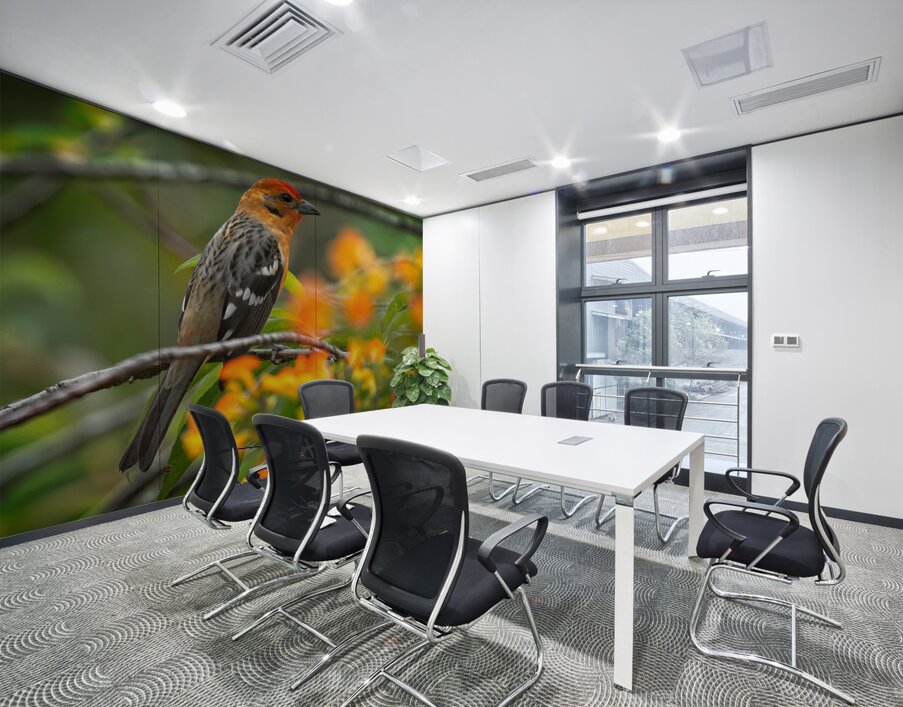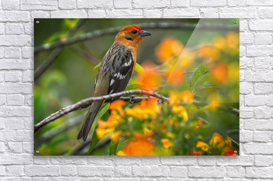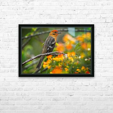 Bright oranges meet soft greens as this stunning bird perches among vibrant flowers. It’s cheerful, lively, and guaranteed to bring a burst of color to your wall.