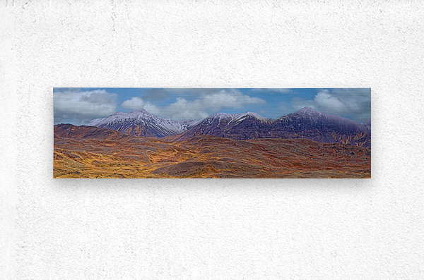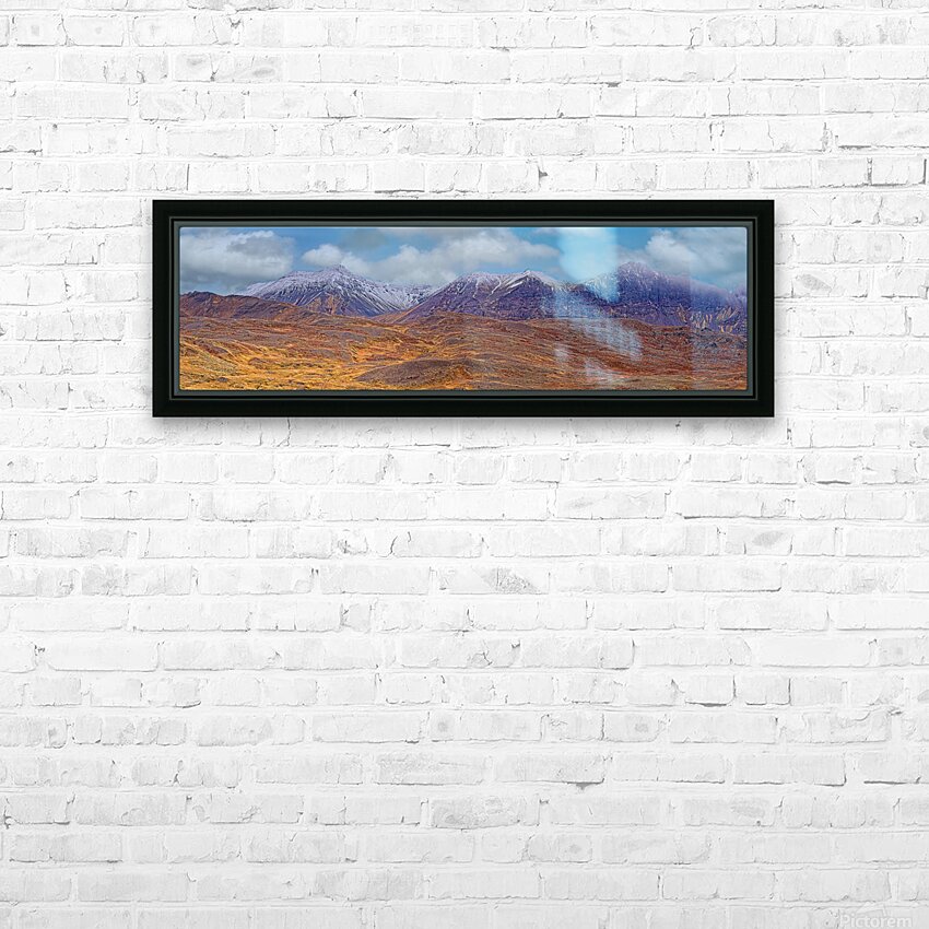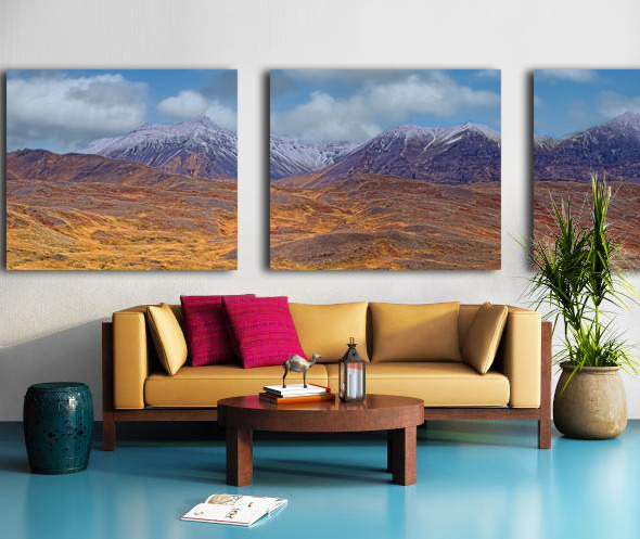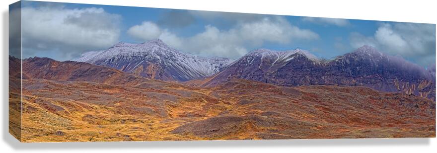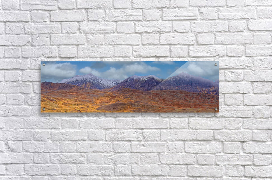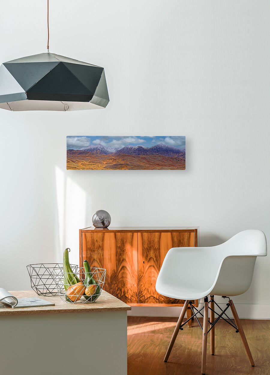 Capture the drama of the wild with this panoramic view of rugged mountains dusted with snow. Bold colors and crisp detail make this piece a stunning focal point for modern homes and offices alike.