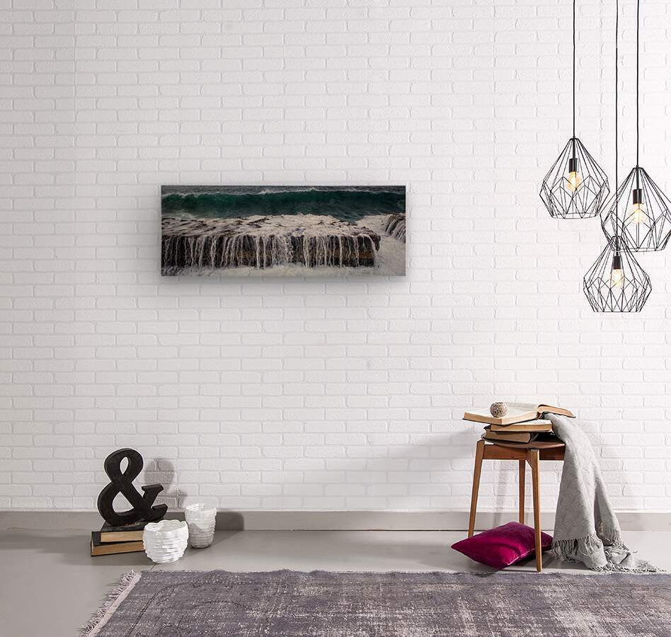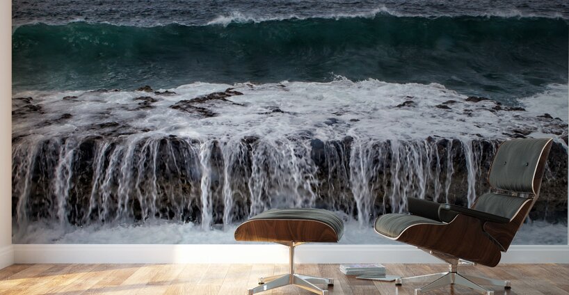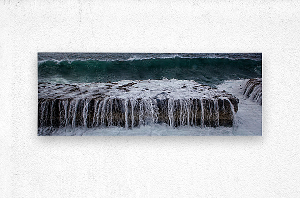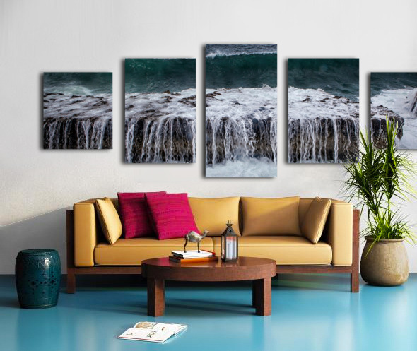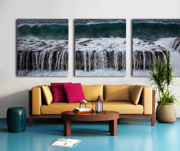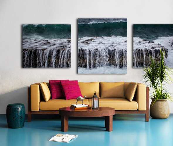 A dramatic wave crashes over a rugged stone shelf, cascading into beautiful vertical streams of whitewater. This dynamic, high-energy artwork is perfect for coastal decor lovers and anyone wanting a bold, powerful statement piece.
