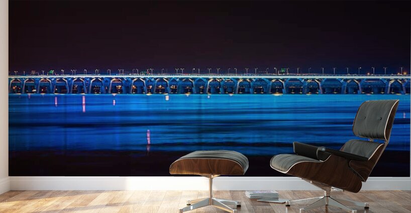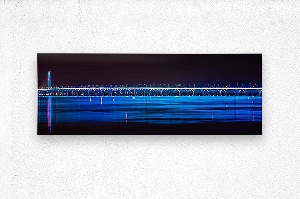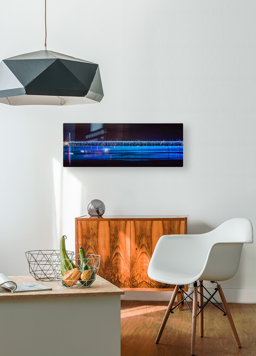 A striking modern-night panorama showcasing Montreal’s Champlain Bridge glowing in electric blue tones. The shimmering reflections across the water create a dramatic, contemporary aesthetic—perfect for adding a bold, sophisticated accent to urban-inspired interiors.