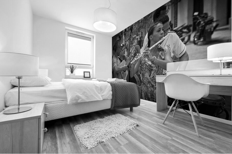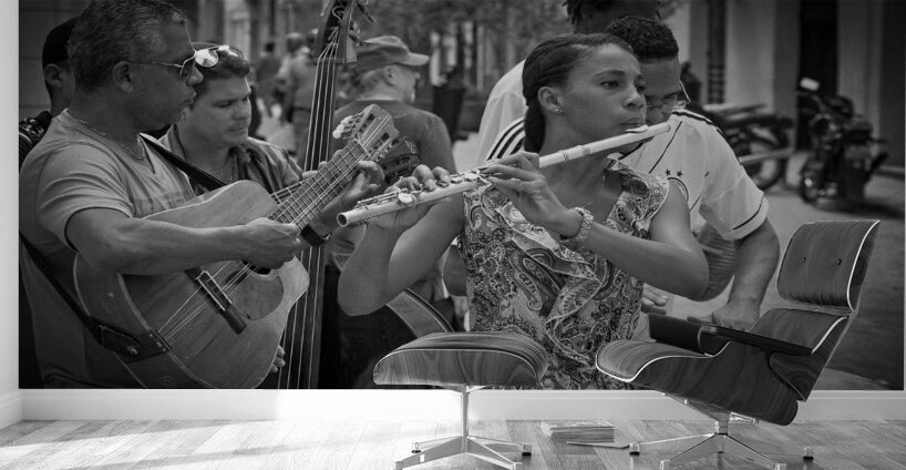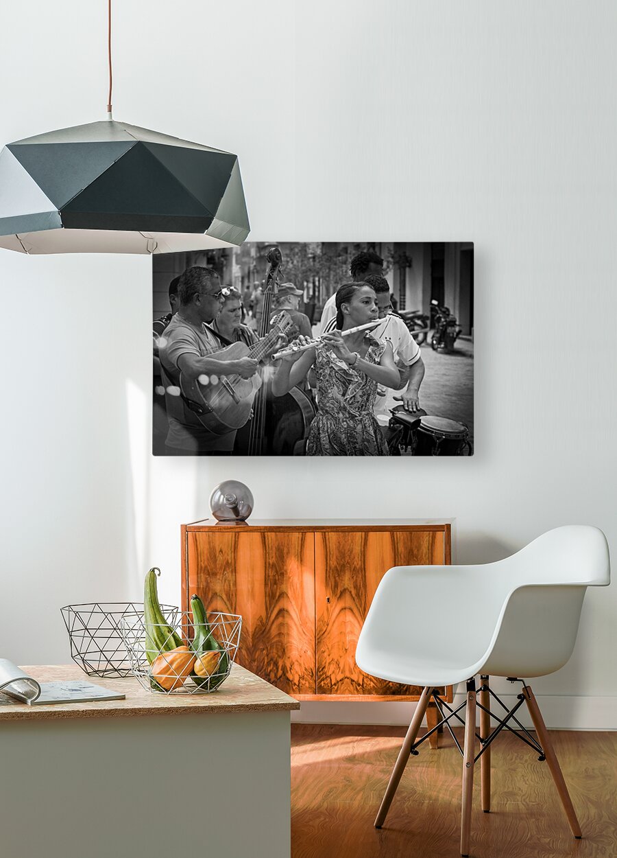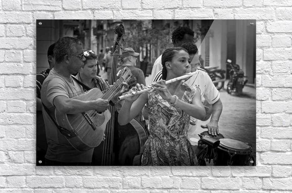 A young flutist leads an impromptu ensemble in the heart of Havana, her poise and focus cutting through the lively street rhythm around her. The monochrome palette accentuates every expression, every gesture, and every note imagined. This photograph celebrates the soul of Cuban street culture—alive, passionate, and irresistibly musical. A powerful addition for collectors drawn to human stories and the vibrancy of everyday artistry.