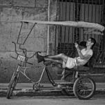 A rickshaw driver reclines in his bicycle taxi, capturing a quiet, intimate moment amid Havana’s energetic streets. A perfect blend of human emotion...[+]