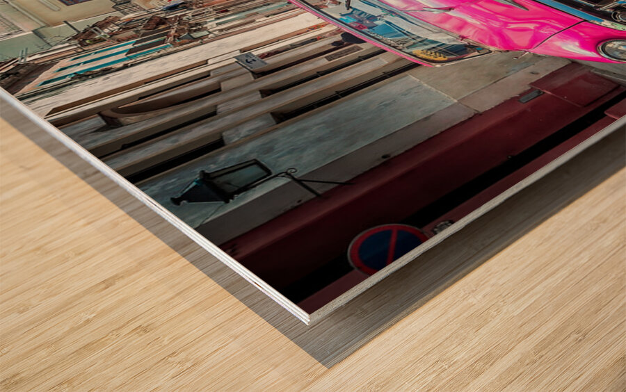 A vibrant slice of Old Havana, this striking print captures a brilliant pink classic car rolling through a charming, timeworn street. The contrast of bold color against historic architecture makes this piece a standout conversation starter—perfect for collectors who love energy, nostalgia, and Cuban character.