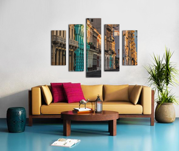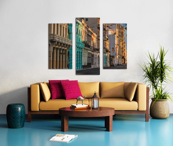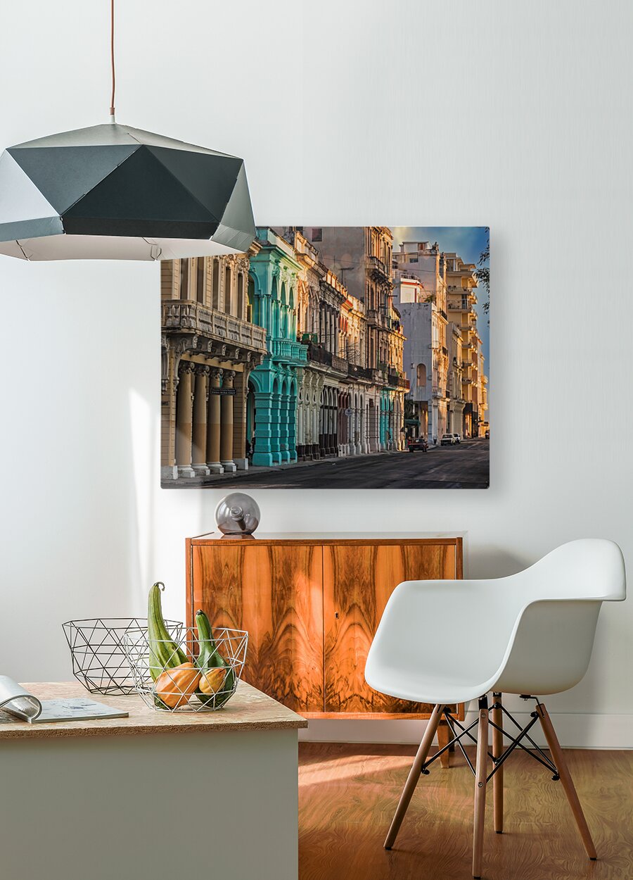 Golden sunlight washes over ornate colonial facades along a quiet Havana street. Rich textures and pastel tones make this piece ideal for lovers of architecture and atmospheric cityscapes.