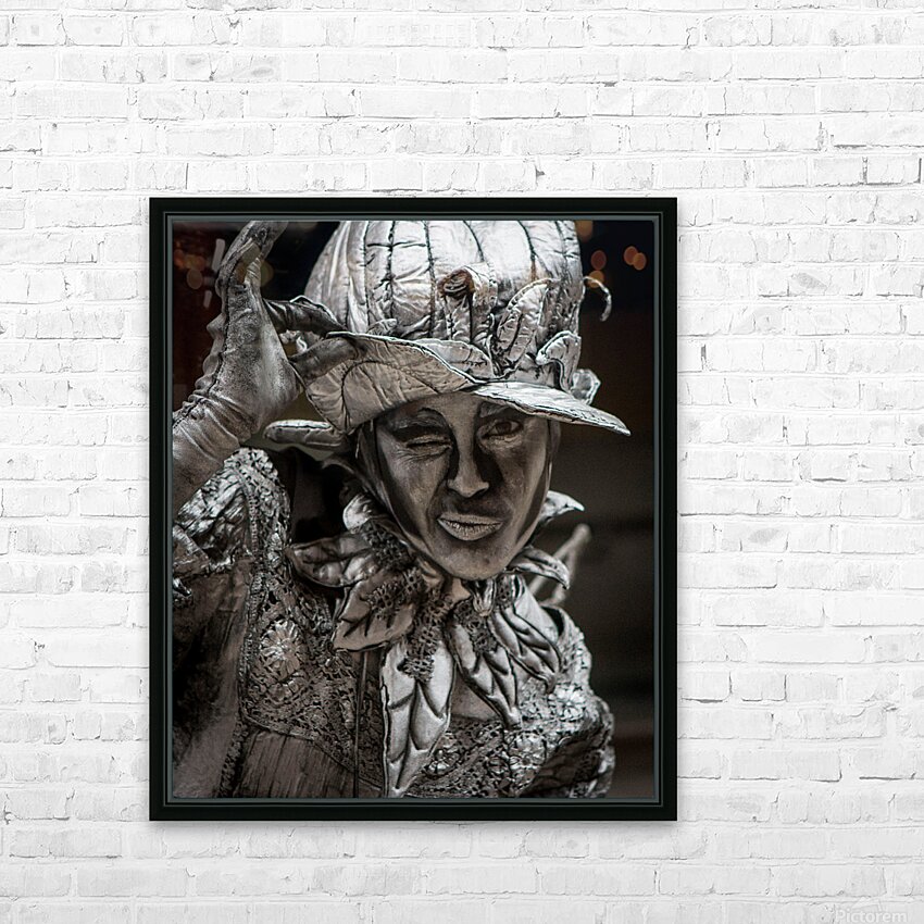 A striking close-up of a street performer painted head-to-toe in metallic silver. The fine textures and expressive wink create a captivating, sculpture-like portrait perfect for collectors of unique character studies.