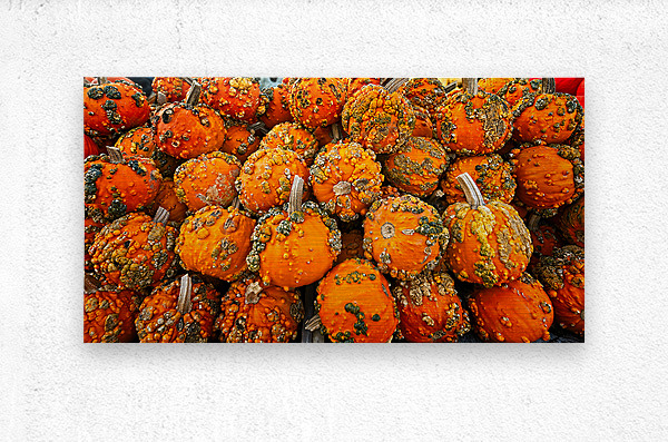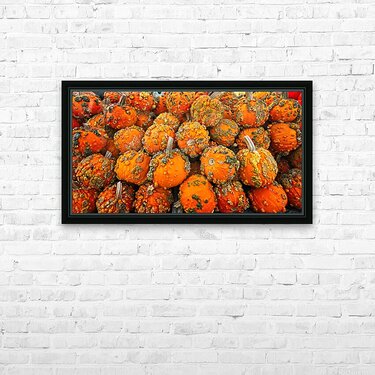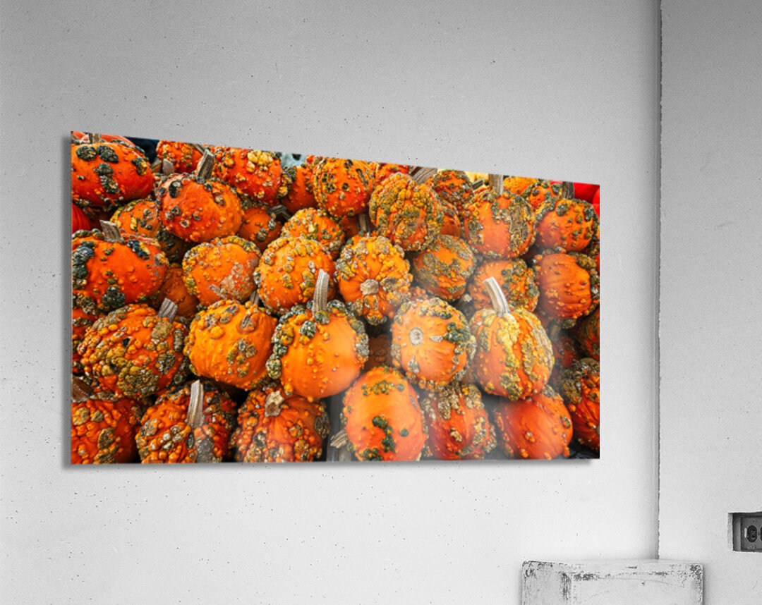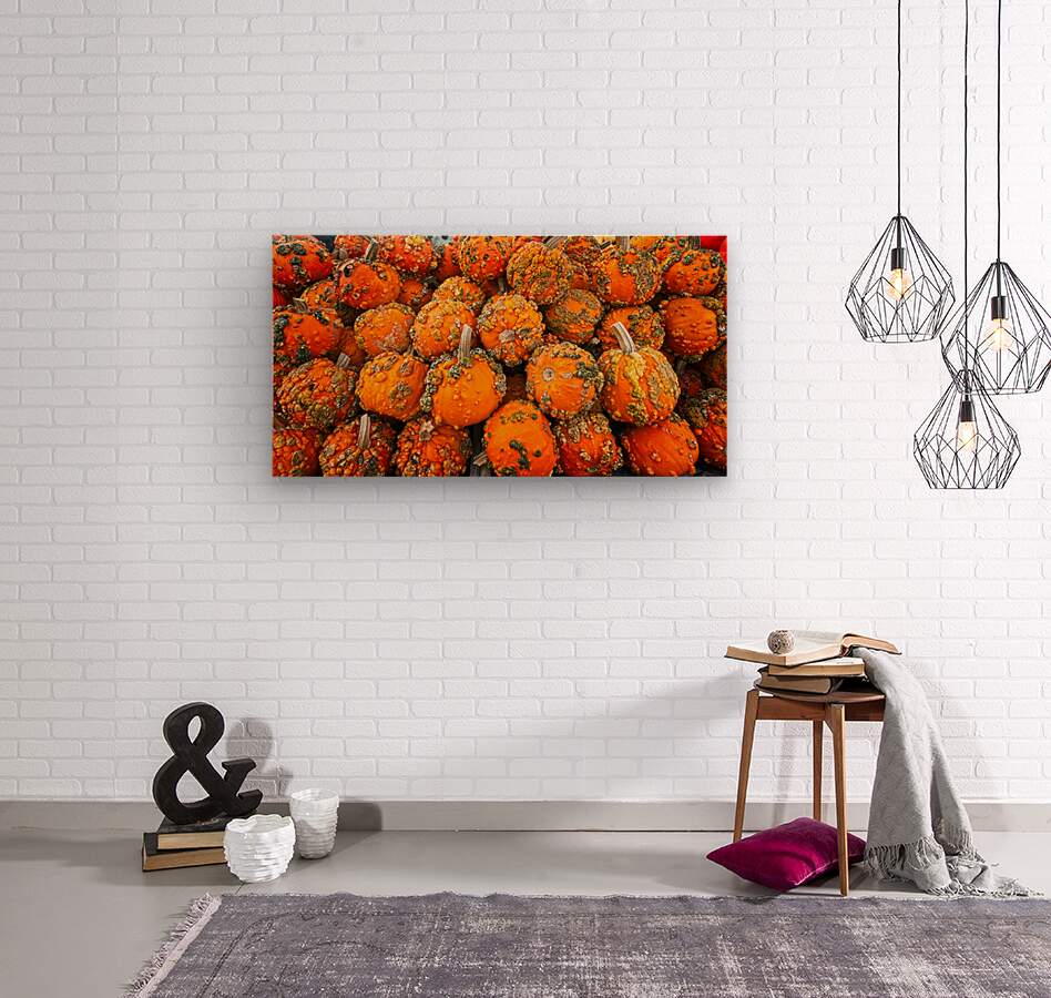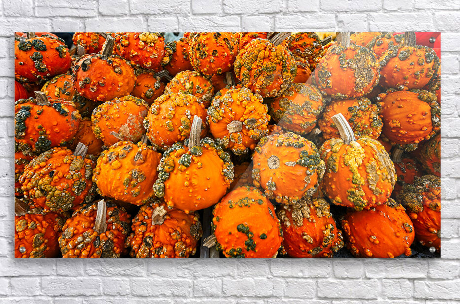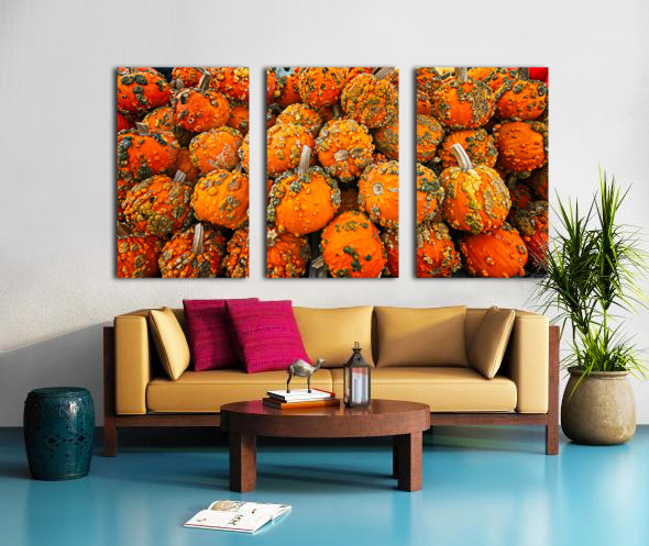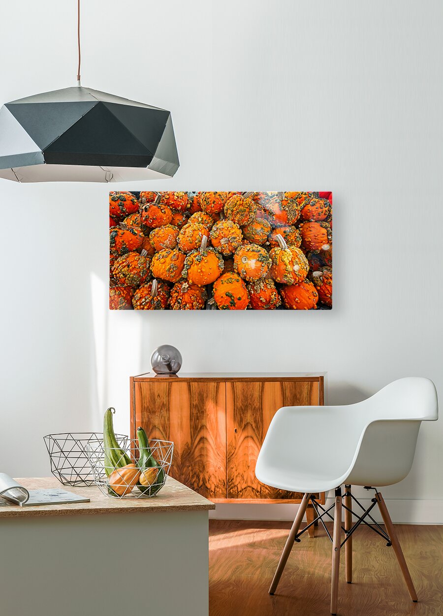 A vibrant tapestry of textured mini-pumpkins fills the frame with bold oranges and rustic greens. This energetic composition brings the warmth and spirit of autumn indoors — perfect for kitchens, dining rooms, or any space craving a festive, organic touch.